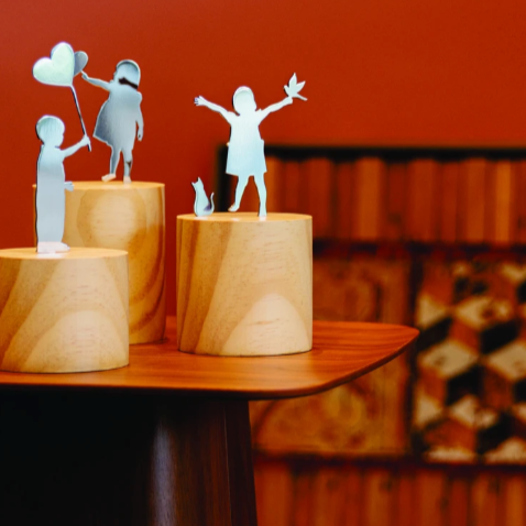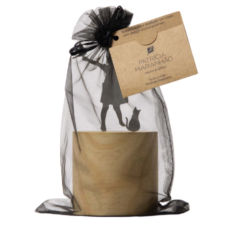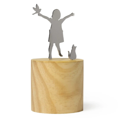 Produzida com silhueta em aço inox de 2 mm, delicadamente polida à mão para um brilho impecável, apoiada sobre uma base de madeira de reflorestamento, que carrega a textura e o cuidado da natureza.